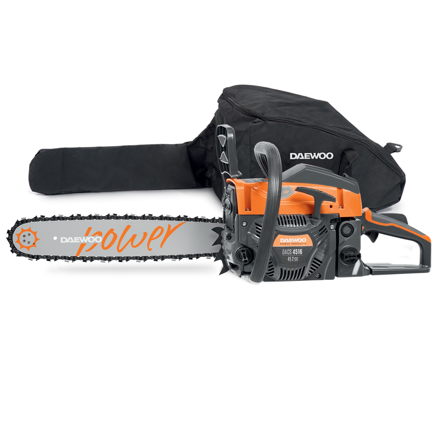 Бензиновый двигатель DAEWOO. 2-х тактный двигатель 045 two stroke объемом 45.2 см³ специально разработан для цепных пил. Он обеспечивает стабильную работу пилы на высоких оборотах с максимальным крутящим моментом.