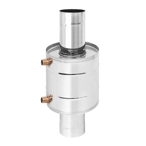 Теплообменник для бани 6л устанавливается в основании дымохода и служит для дистанционного нагрева воды в выносном баке (баке для регистра). Бак устанавливается выше уровня регистра и вода греется за счет естественной циркуляции. У теплообменника 2 штуцера с резьбой 3/4" для циркуляции воды.