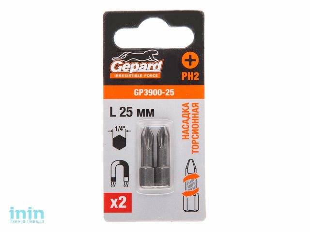 Насадка крестообразная PH2 25мм 2шт торсионная GEPARD (GP3900-25) (бита Phillips сталь S2 магнитная)