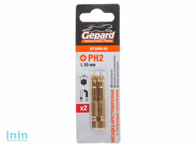 Насадка крестообразная PH2 50мм 2шт с титановым напылением GEPARD (GP3800-50) (бита Phillips сталь S2 магнитная TIN покрытие)