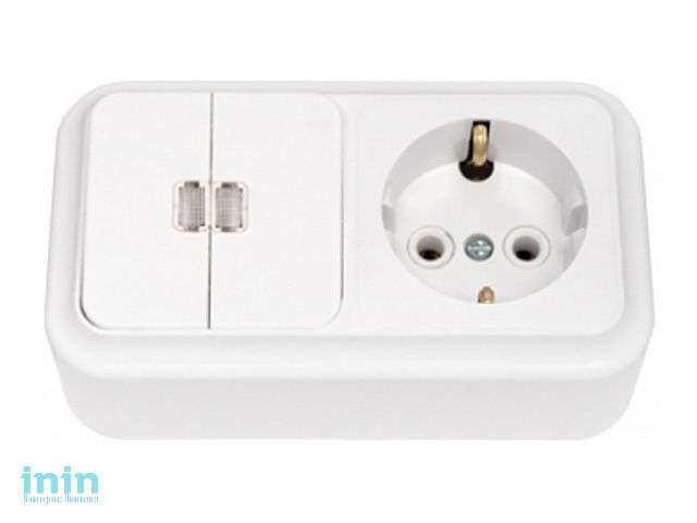 Блок выкл. 2 клав. + розетка (открытая, с/з) со световой индикацией, белая, Пралеска, BYLECTRICA (Гарантийный срок:24 месяца)