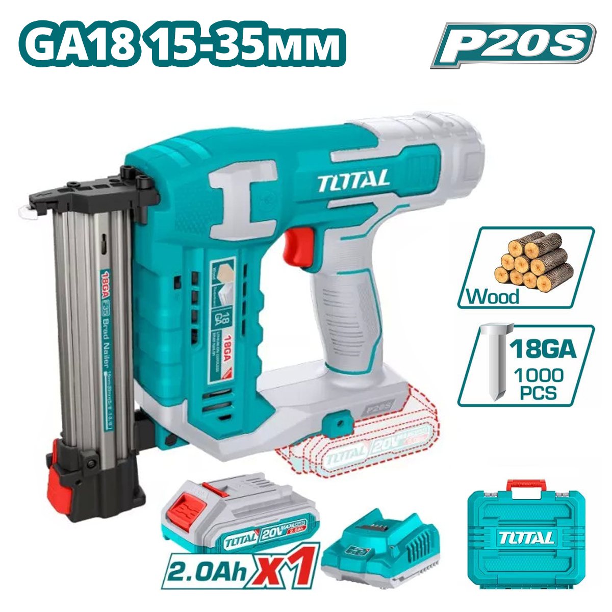 Комплектация: Пистолет гвоздезабивной аккумуляторный .1000 шт. гвоздей (35 мм) 1 шт. воздушная насадка 1 шт. штифт 1 шт. аккумулятор 20 В 2,0 Ач (TFBLI2001) 1 шт. зарядное устройство (TFCLI2001E)