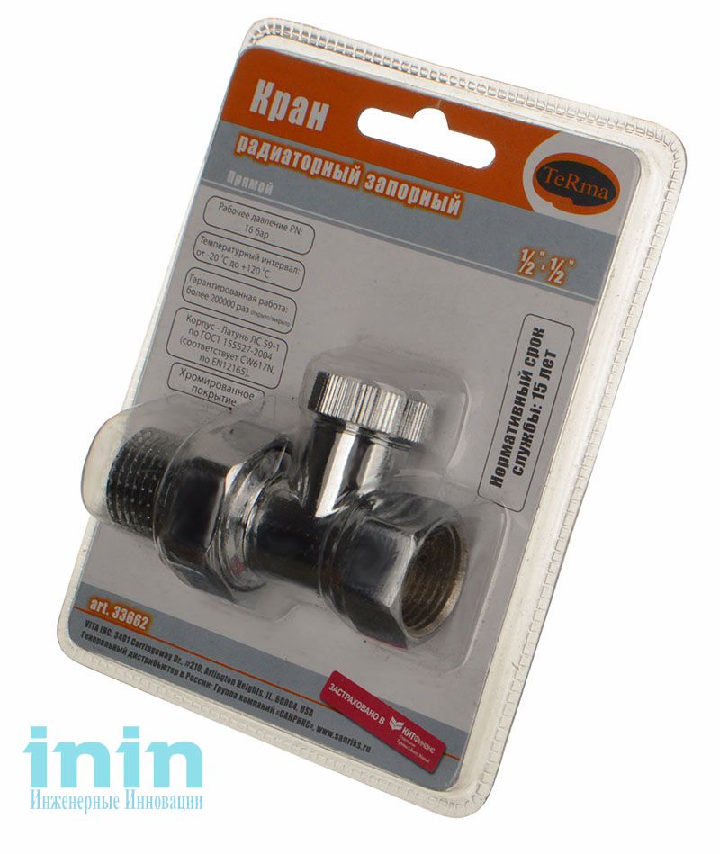 Запорный кран прямой для радиатора TeRma является отсекающей арматурой. Его основное назначение – перекрытие потока теплоносителя, чтобы можно было снять радиатор и при этом не сливать систему отопления и не перекрывать весь стояк. Кран допускается монтировать в любом положении, обычно он устанавливается на выходе (по ходу движения теплоносителя) из радиатора. Данный кран не используется для регулировки потока теплоносителя через радиатор.