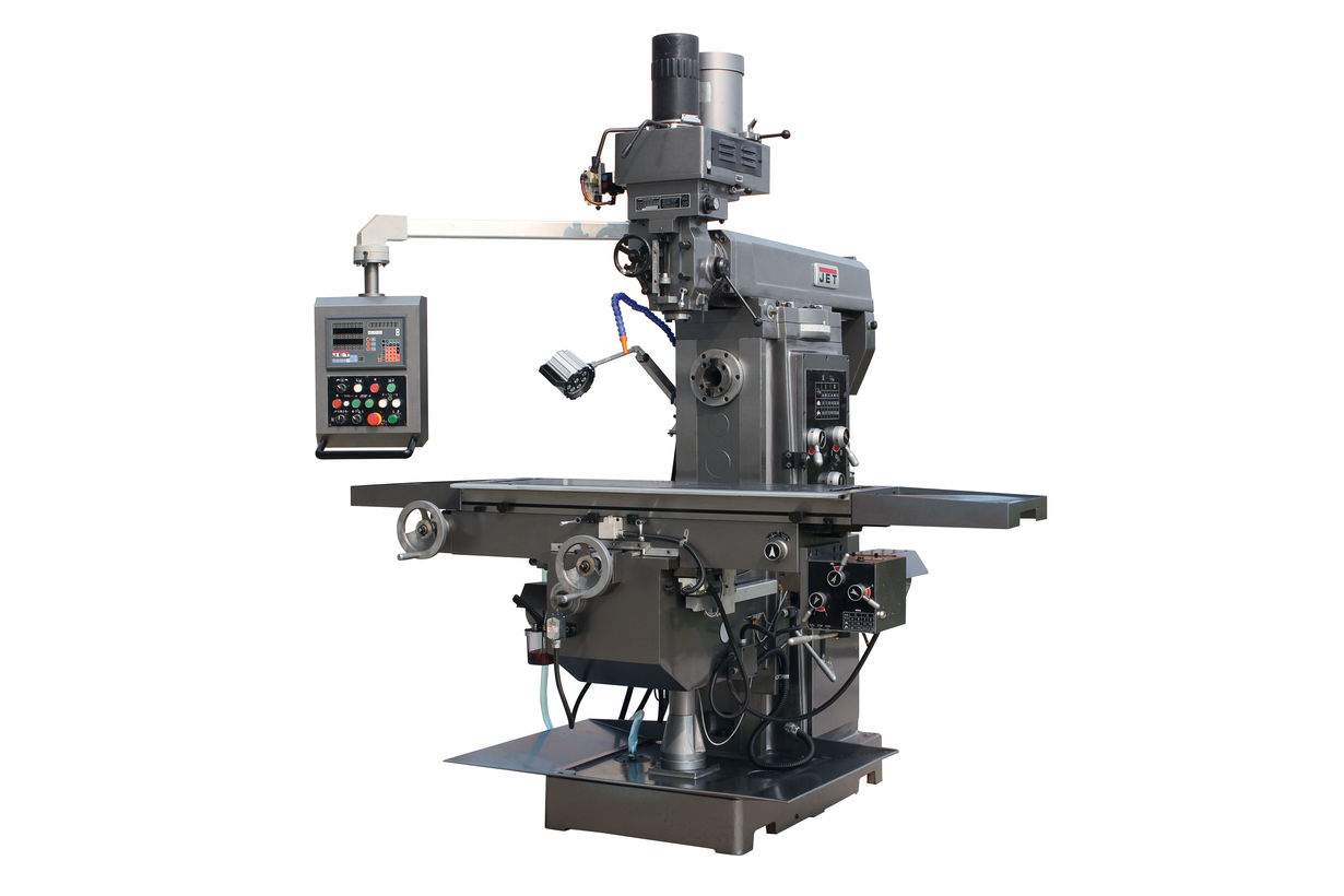 Компания JET представляет JMD-1452TS DRO - широкоуниверсальный фрезерный станок повышенной мощности. Станок предназначен для работы в условиях длительных и тяжелых нагрузок, поэтому его основное назначение - промышленные предприятия, выпускающие серийную продукцию, крупные многопрофильные ремонтные мастерские и т.д.Станок позволяет работать с торцевыми муфтами диаметром до 125 мм и концевыми до 25 мм, максимальный диаметр сверления - 40 мм при ручной подаче и 20 мм с автоматической. На станках данного класса устанавливаются два шпинделя. Вертикальный может работать на скоростях от 70 до 3600 об/мин с автоматической подачи пиноли 0,045/0,86/0,142 мм/об. Ход пиноли - 127 мм, расстояние шпиндель - стойка 150-550 мм, шпиндель - стол - 200-650 мм. Предусмотрен наклон шпиндельной головки влево/вправо. Горизонтальный шпиндель способен развивать скорость 70-1800 об/мин, параметр ось шпинделя - стол - 0-450 мм. Фрезерный стол станка увеличен до 1320х360 мм, перемещение по трем осям 1000х300х450 мм. Устройство автоподачи обеспечивает перемещение стола по осям Х и Y 15-370 об/мин, по оси Z - 575 мм/мин. На JMD-1452TS DRO установлен пневматическая зажимная тяга вертикального шпинделя (пневматический шомпол), предусмотрено наличие высокоточного Устройства цифровой индикации (цифровых линеек) по трем рабочим осям с ценой деления 0,005 мм. Станок поставляется в богатой комплектации, включая систему подачи СОЖ, светодиодную лампу освещения рабочей зоны, цанговый патрон с набором цанг, сверлильный патрон и многое другое.