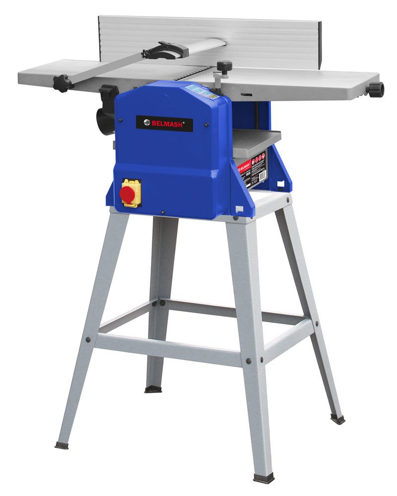 Модель имеет настольное исполнение. Корпус сборный, выполнен из стали. Верхние столы предназначены для строгания/фугования заготовок. Нижний рабочий стол –для рейсмусования. Строгальные и рейсмусовые столы, параллельный упор выполнены из алюминия. Угол наклона упора регулируется. Нужная высота настраивается с помощью рукоятки. Вал оснащен двумя ножами. Удаление отходов резания осуществляется через съемный кожух. Имеется токовая защита.