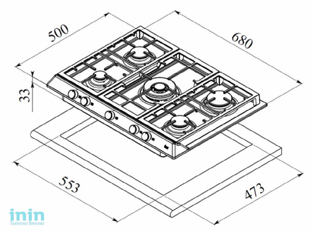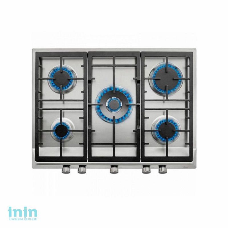 Газовая варочная панель, сверкающие чёрные фронтальные регуляторы с ободком под металл, профессиональные чугунные решётки образуют единую поверхность для скольжения посуды, нержавеющая сталь, автоподжиг на каждой  горелке, газ-контоль на каждой горелке, 5 зон приготовления с высокоэффективными горелками (69%): 1 горелка с двойным пламенем (4кВт), 1 основная горелка (2,8 кВт), 2 средних горелки (1,75 кВт), 1 дополнительная горелка (1,0 кВт), тип газа: LPG (бутан, пропан,), природный, размеры в мм: 680х500х52