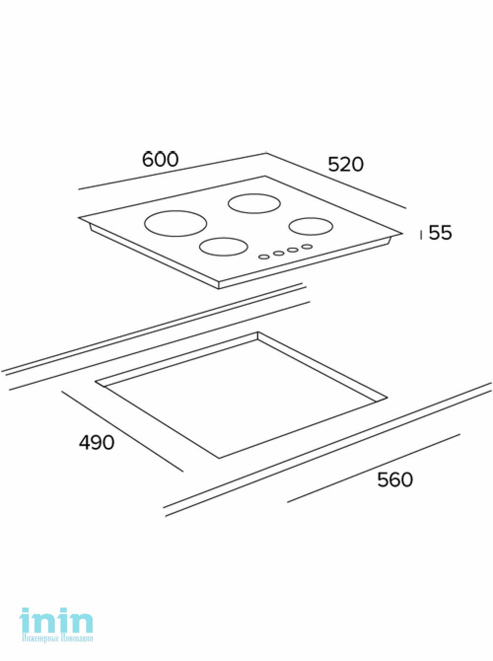 Газовая варочная панель, нержавеющая сталь толщиной 0,7 мм, регуляторы под цвет металла, чугунные решётки, газ-контроль, авто-поджиг, 4 зоны приготовления: 1 основная горелка (3,3 кВт), 2 средних горелки (1,75 кВт), 1 дополнительная горелка (1 кВт), тип газа: LPG (бутан, пропан,), природный, размеры в мм: 590х510,  вырез 560х490