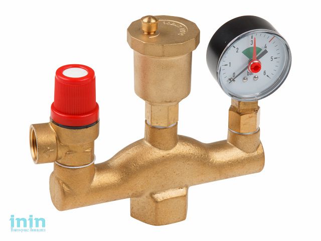 Комплектная группа безопасности для оснащения котлов. Применяется в установках с тепловой мощностью до 44 кВт (определяется штатным предохранительным клапаном), номинальным давлением не выше 10 бар, рабочей температурой не более 120 °С. Допустимая рабочая среда - пар, вода, незамерзающий теплоноситель (максимальное содержание гликолей - 50 %). Состав изделия: предохранительный клапан (настройка - фиксированная, 3 бара), автоматический воздухоотводчик, манометр, латунный никелированный корпус. Группа безопасности котла монтируется на выходе теплогенератора. Резьба присоединения - внутренняя, 1".