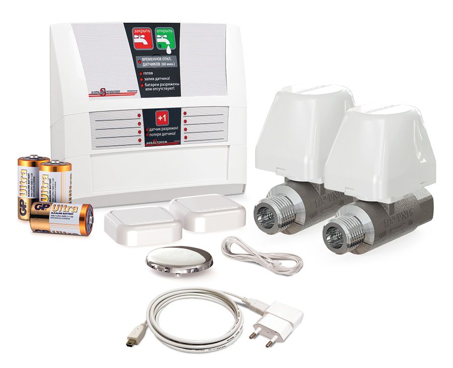 - 2 шаровых крана 1/2" - Контроллер Классика - 2 проводных датчика Классика - Провода (4 м) - 3 батареи R14 - Крепеж