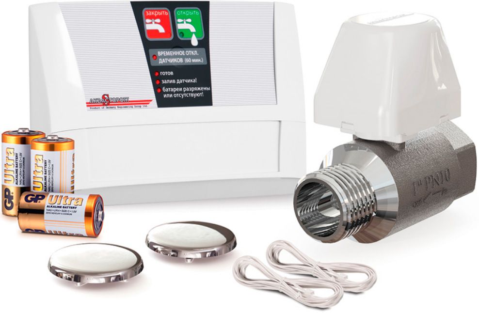- 2 шаровых крана 1/2" - Контроллер Классика - 2 проводных датчика Классика - Провода (4 м) - 3 батареи R14 - Крепеж