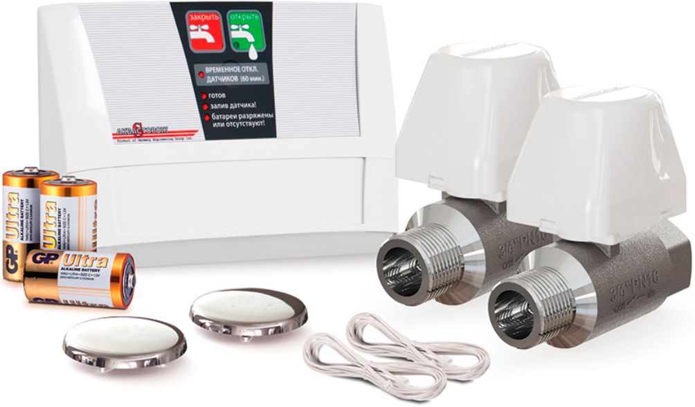 - 2 шаровых крана 1/2" - Контроллер Классика - 2 проводных датчика Классика - Провода (4 м) - 3 батареи R14 - Крепеж
