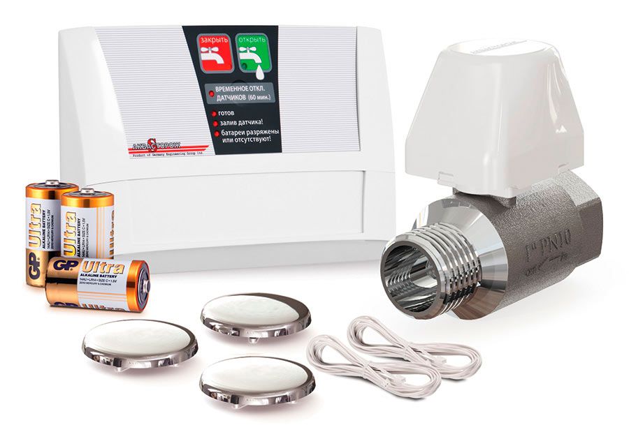 - 2 шаровых электрокрана 1/2" (15мм), - контроллер Классика - 3 проводных датчика Классика, провода (по 4м) - блок питания 5.5 В - батареи R14 (тип С)-3 шт - крепеж - Инструкция