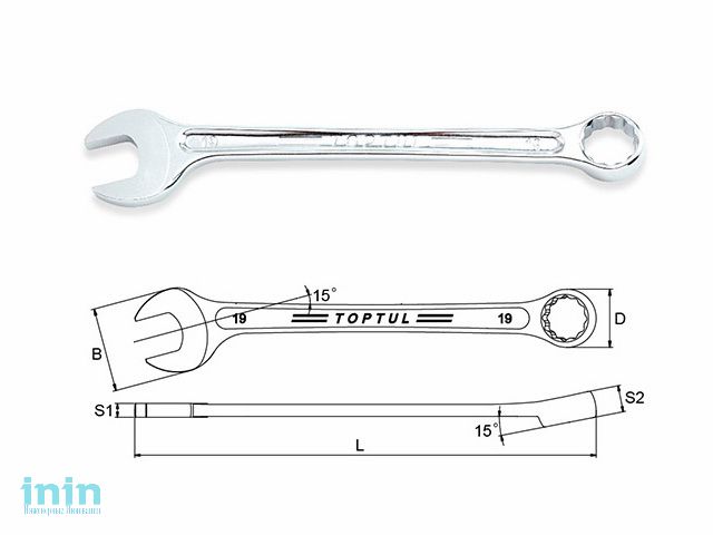 Ключ комбинированный TOPTUL имеет окончание в виде рожкового ключа с одной стороны и окончание в виде накидного ключа с 15° смещением по отношению к рукоятке с другой стороны.