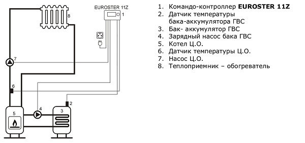 Euroster 11Z это электронный, программируемый, микропроцессорный двухканальный контроллер, предназначенный для независимого управления двумя насосами: контурным насосом Ц.О. и зарядным насосом бойлера ГВС.