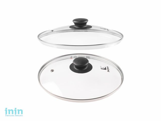 Изготовлена из термостойкого стекла, снабжена отверстием для выхода пара, ободок из нержавеющей стали предохраняет её от повреждений.