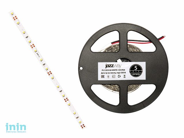 Лента светодиодная PLS 2835/60 (6.0 Вт/м, 480 Лм/м, 3500К, IP20, 12В (5 м в уп.) JAZZWAY (60 диод/м, теплый белый свет, 8 мм)