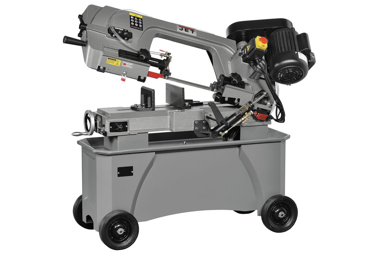Консоль станка оборудована направляющими, позволяющими регулировать проход полотна и предотвращать уводку ленточного полотна в сторону. Наличие в конструкции подшипников обеспечивает позиционирование полотна относительно обрабатываемой заготовки, способствует повышению точности и качеству распила. Ленточнопильный станок оборудован системой подачи СОЖ, имеет удобную тумбу-подставку с колесами для быстрого перемещения. Вес станка составляет 170 кг.