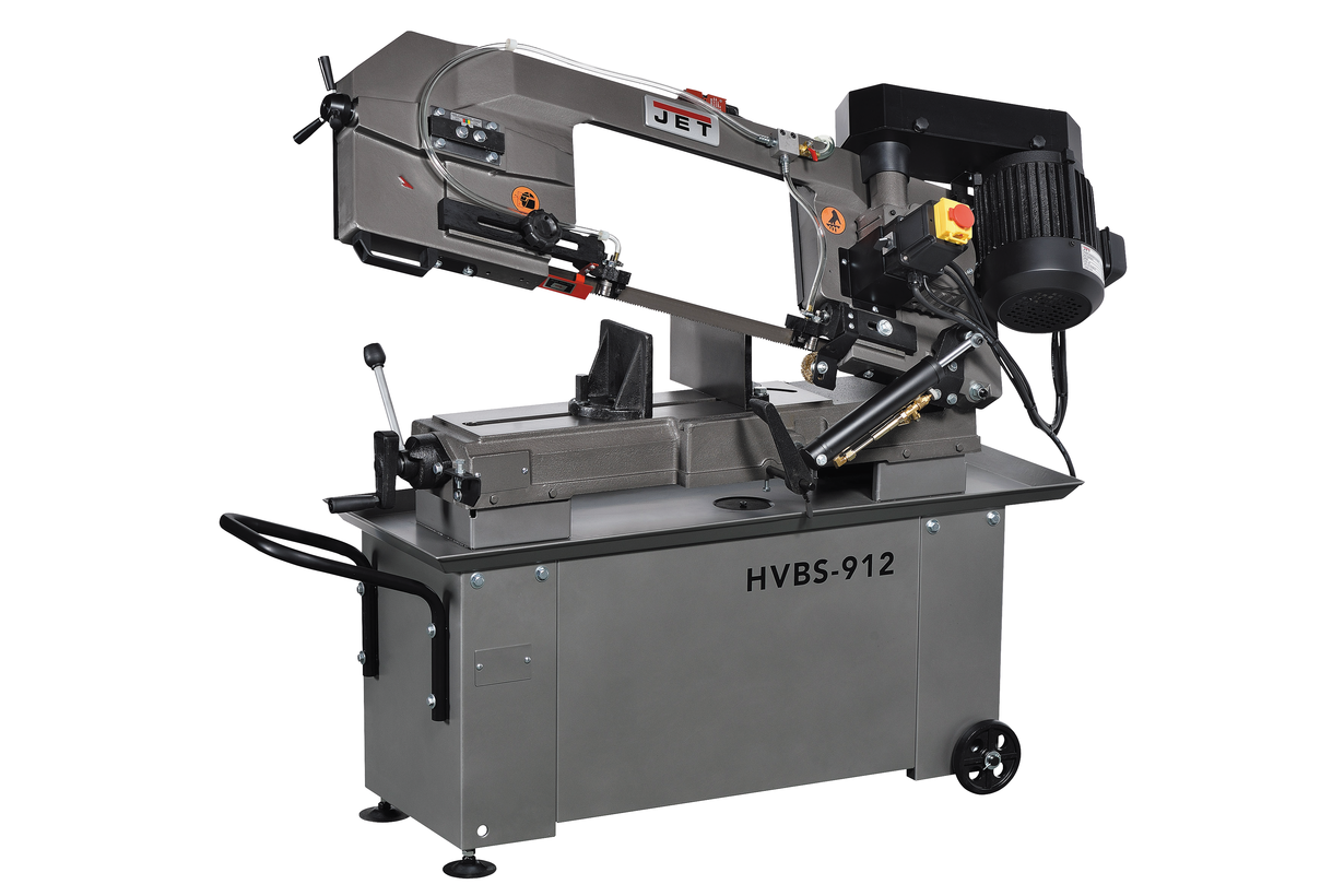 Ленточнопильный станок HVBS-912 имеет стационарную литую консоль, движение которой обеспечивается системой гидроразгрузки. С помощью гидроцилиндра пильная рама плавно опускается в зону резания, достигается необходимое прижимное усилие ленточного полотна на обрабатываемую заготовку. Скорость подачи рамы в зону резания регулируется винтами, расположенными на гидроцилиндре. Модель оборудована системой подачи СОЖ, повышающей качество распила и повышается срок эксплуатации ленточного полотна.