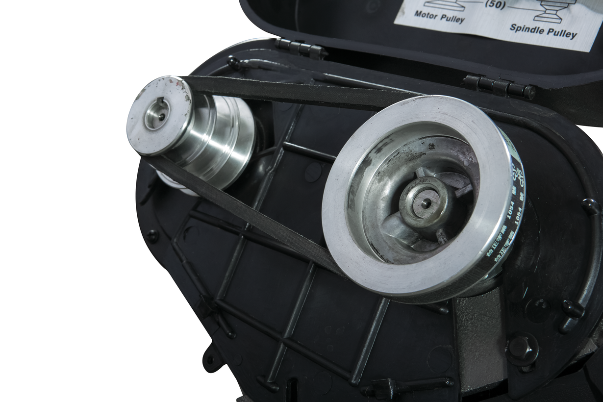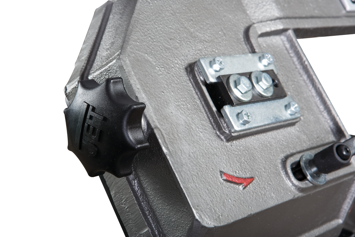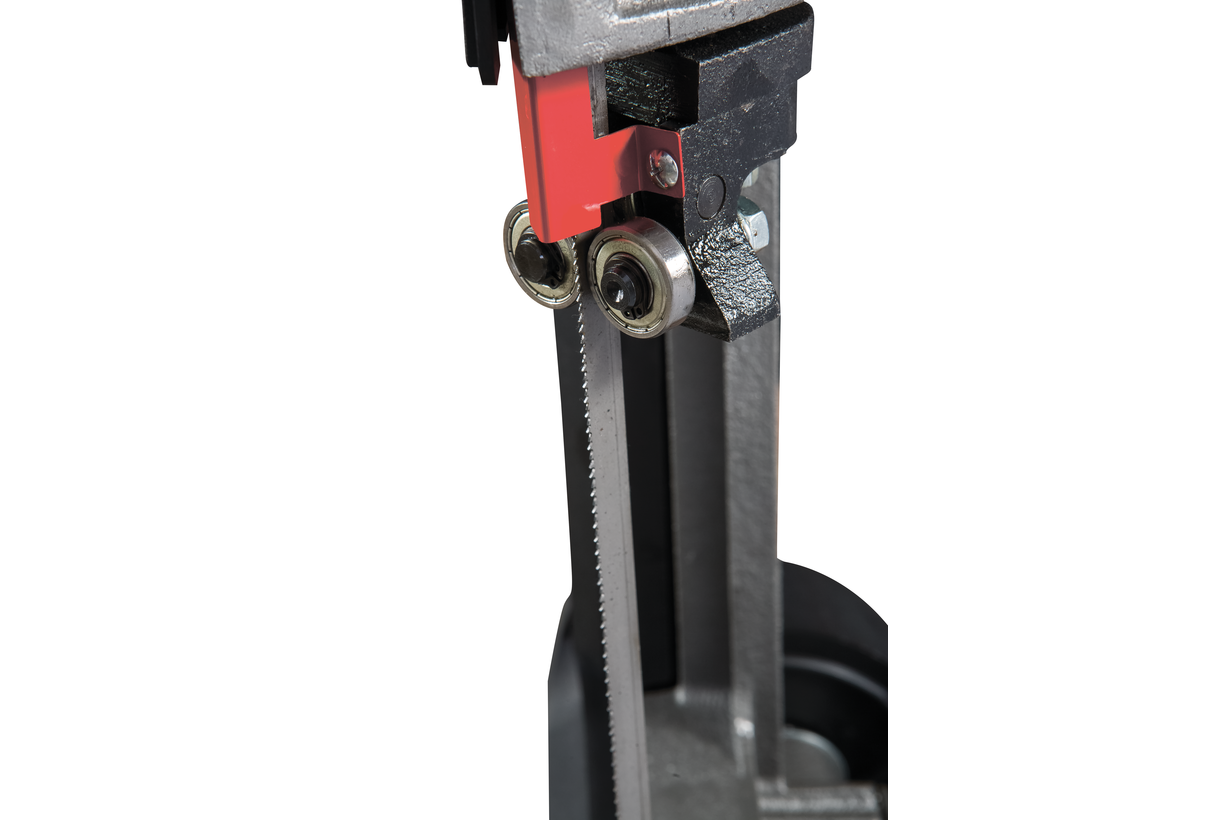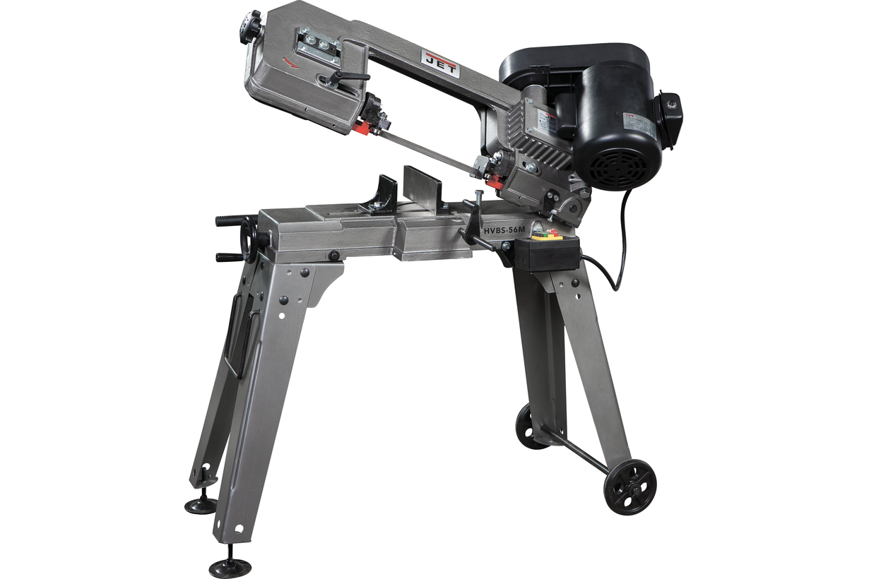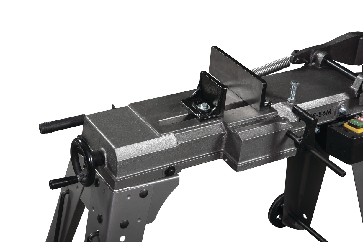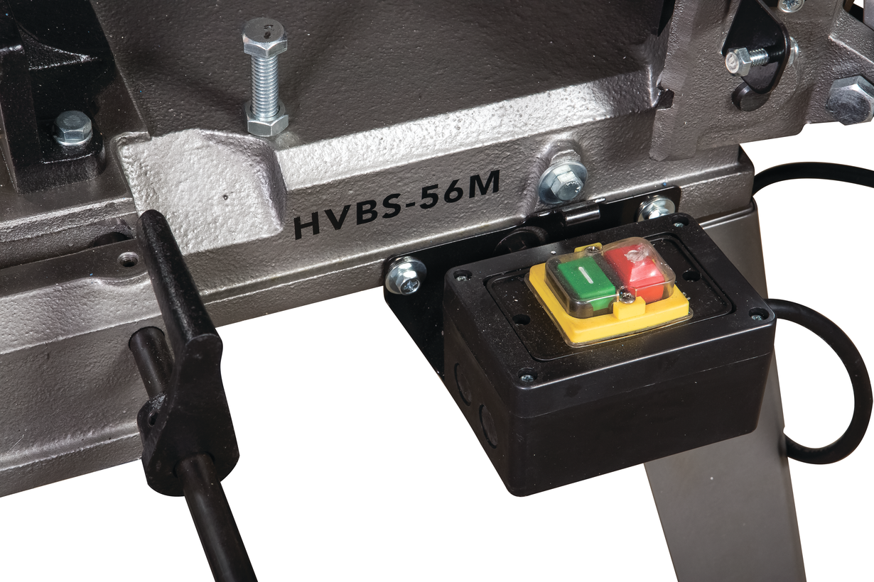 Модель HVBS-56М оснащена компактным электродвигателем мощностью 650 Вт. Станок имеет ременной привод, обеспечивающий движение ленточного полотна в 3-х скоростном режиме, 20,30 и 50 м/мин. Моторная группа имеет систему воздушного охлаждения. На раме установлены направляющие, регулирующие позиционирование полотна при пилении заготовок различного диаметра. Сокращение расстояния между направляющими уменьшает увод полотна, повышает качество распила. Необходимая точность распила достигается благодаря наличию в конструкции станка подшипников, установленных непосредственно в направляющих. Задача подшипников обеспечить постоянное перпендикулярное положение полотна по отношению к заготовке в процессе распила.
