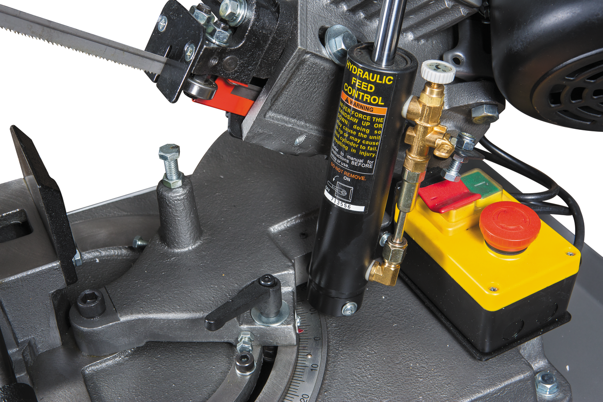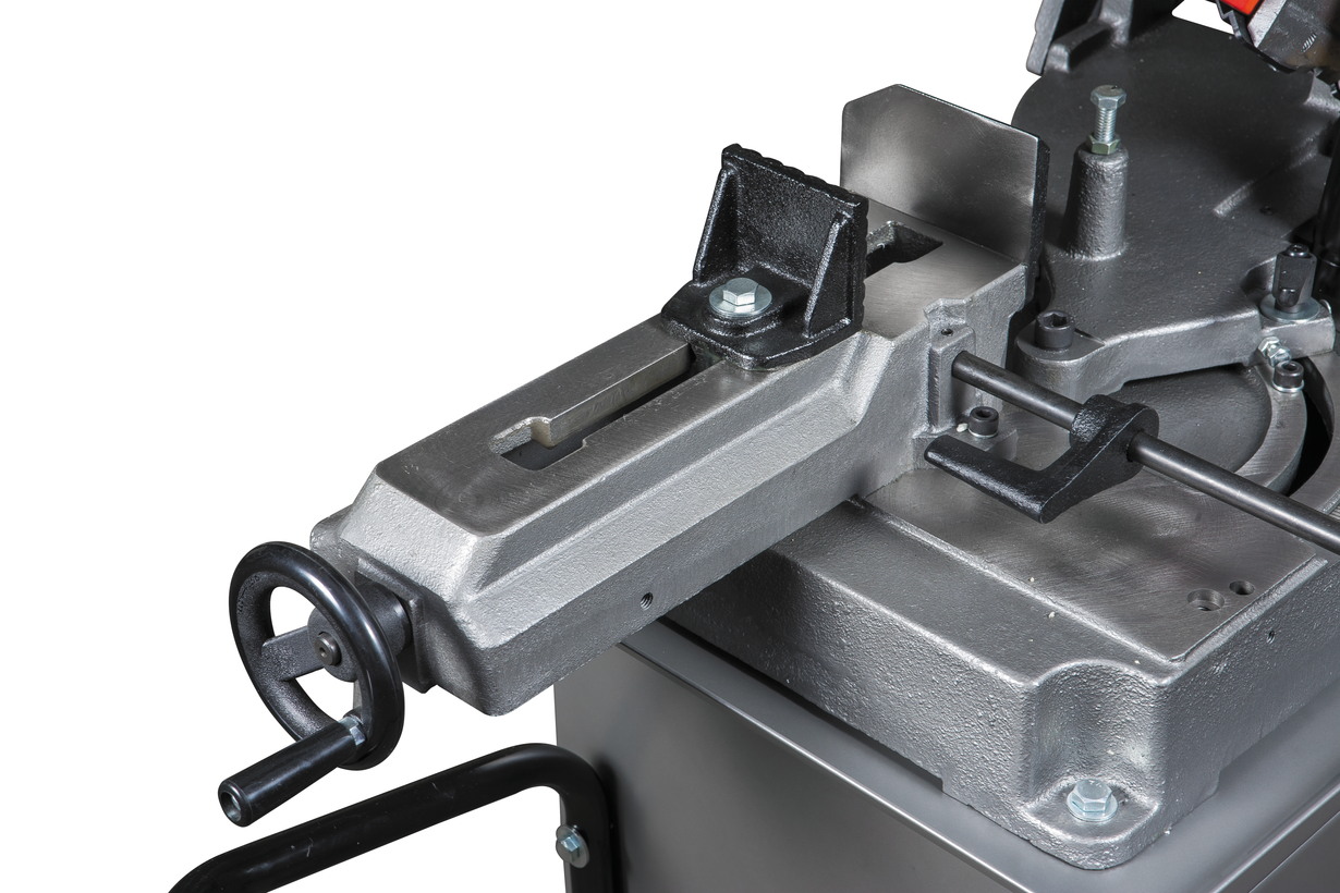 Модель MBS-56CS представляет собой ленточнопильный станок, рассчитанный на массовое серийное производство, используемый в домашних условиях для индивидуальной работы. Конструкция станка выполнена по европейскому типу, с поворотной рамой. Поворот рамы в нужное положение осуществляется при помощи шкалы, в диапазоне -45 0 – 60 0 . Для удобства работы в конструкции станка предусмотрено установка тисков в двух положениях. Основная особенность этой модели - наличие системы гидроразгрузки, обеспечивающей плавность и легкость опускания и подымания консоли. С помощью гидроцилиндра регулируется прижимное усилие пильной рамы, скорость подачи рамы на обрабатываемую заготовку. Модель предназначена для распила круглых заготовок максимальным диаметром 125 мм.