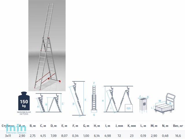 Высота лестницы - 709см, высота стремянки - 275см, высота секции - 290см.