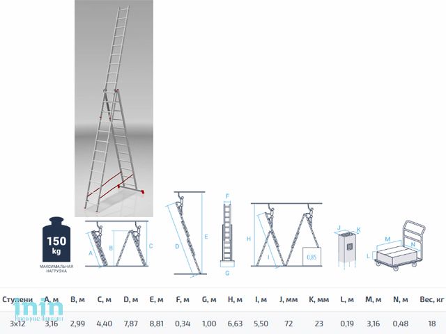 Высота лестницы - 787см, высота стремянки - 299см, высота секции - 316см.