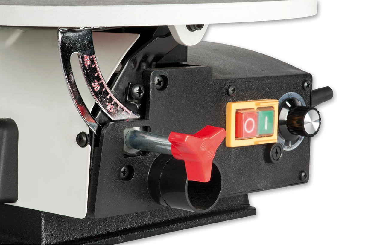 Для распиловки под углом к поверхности предусмотрен механизм наклона рабочего стола, оборудованный транспортирной шкалой и стопором с лицевой стороны. Для удаления опилок с линии реза есть регулируемый патрубок для сдува опилок и 35-миллиметровый штуцер подключения к системе пылеотсоса.