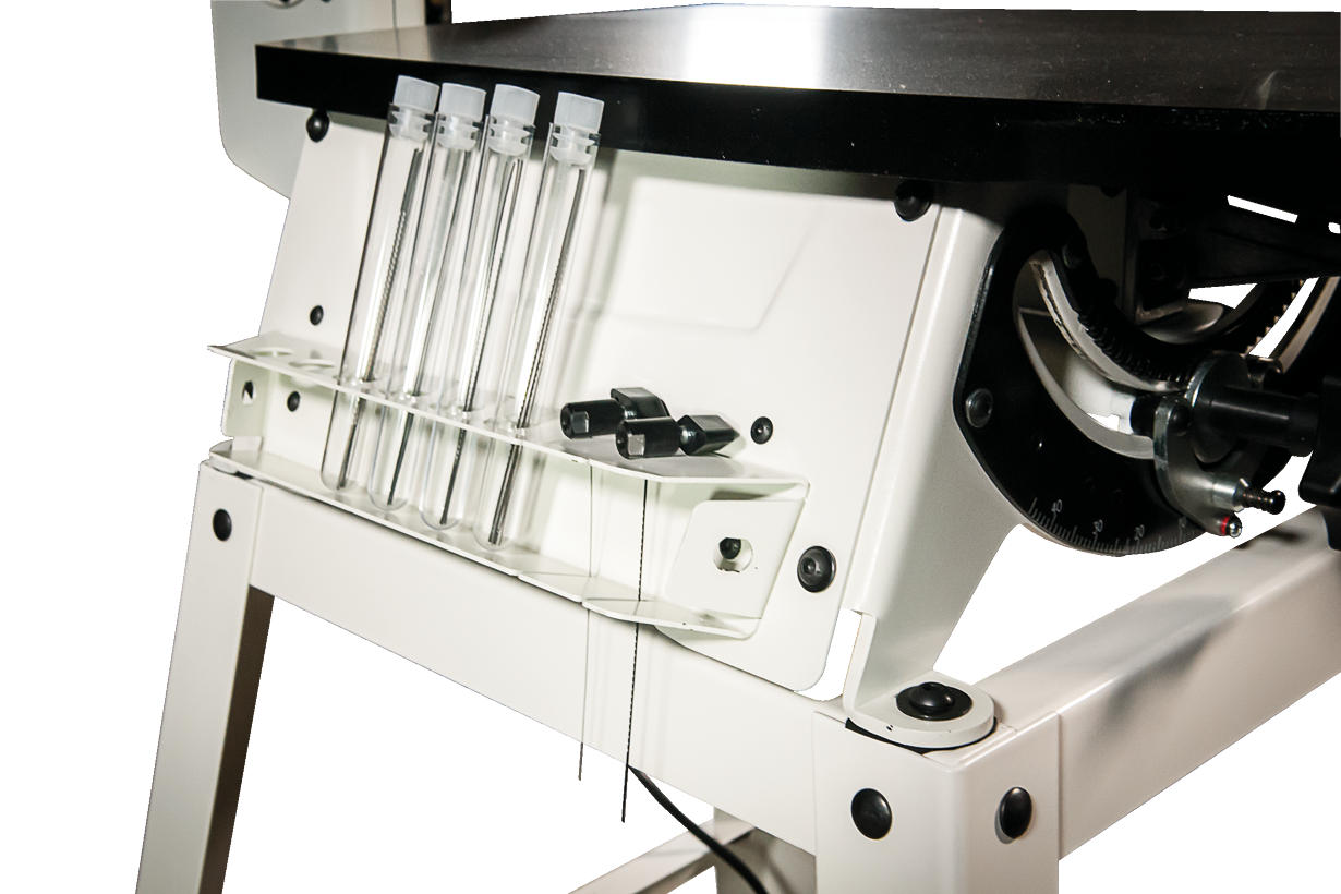 Станок работает с пильными полотнами без штифта. Верхняя часть пилки зажимается эксцентриковым механизмом, совмещенным с натяжителем, нижняя предварительно зажимается в адаптер, а после вставляется в вилку-оправку. В комплекте два таких адаптера, что позволяет иметь в быстром доступе полотна разных типов. Благодаря наличию прорези в рабочем столе существенно упрощается установка на стол заготовок с продетой пилкой.
