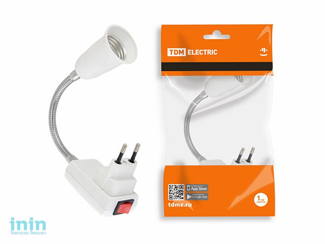 Переходник вилка-Е27 гибкий 150мм с выключателем, белый, TDM