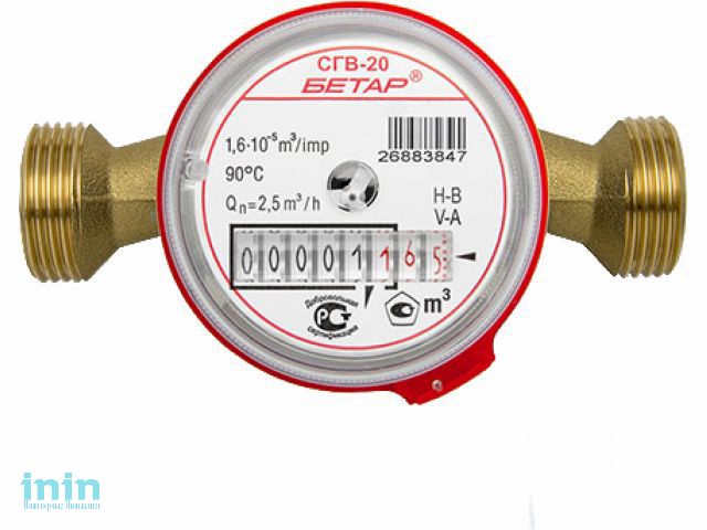 Счетчик для горячей воды СГВ-20 РФ "ВIР-М" (Дополнительные элементы: Фильтр косой, Комплект монтажный или Узел присоединительный) (Бетар)