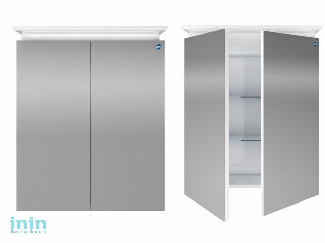 Зеркальный шкаф с двумя дверцами на петлях с доводчиками, интегрированная подсветка, 2 полки. Цвет боковин - белый. Корпус/фасад в краске.