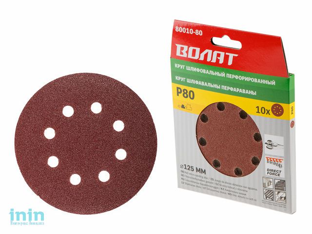 Шлифлист 125мм круг Р60 д/дерева 8 отв. 10шт. ВОЛАТ (круг абразивный шлифовальный перфорированный)
