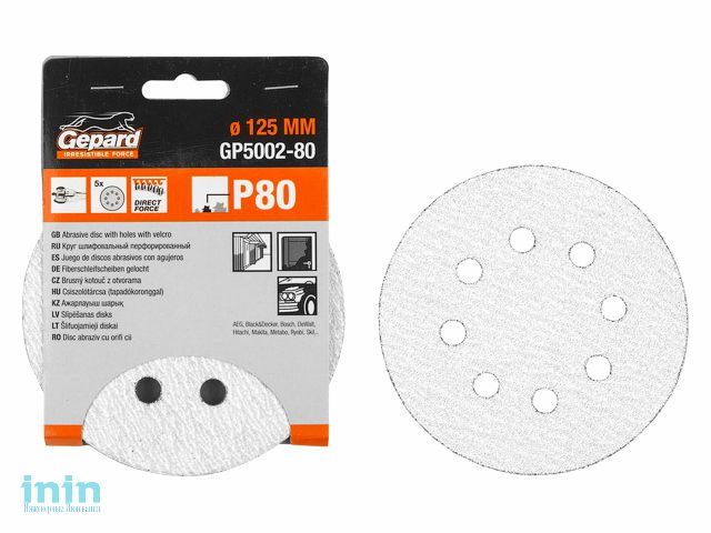 Шлифлист 125мм круг Р80 д/краски 8 отв. 5шт. GEPARD (GP5002-80) (круг абразивный шлифовальный перфорированный)