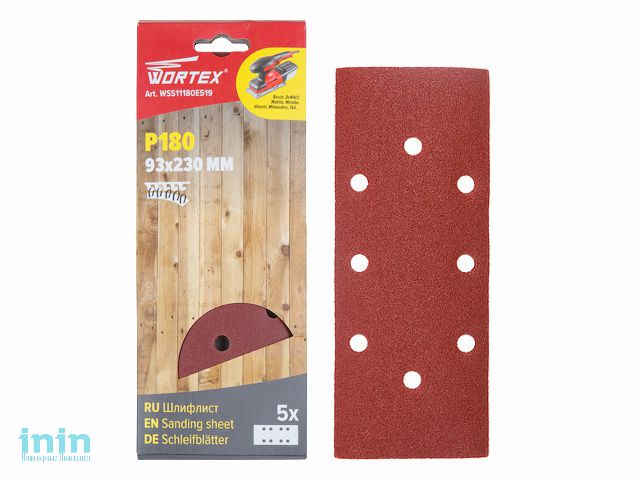 Шлифлист 93х230мм Р180 д/дерева самосцепл. 8 отв. 5шт WORTEX