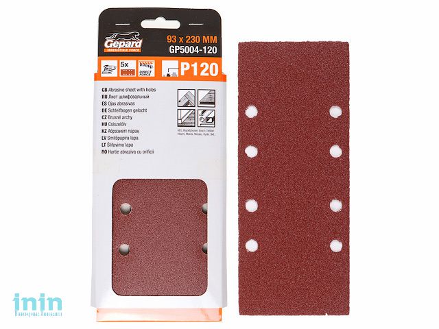Шлифлист 93х230мм Р60 д/дерева 8 отв. 5шт. GEPARD (GP5004-60) (лист абразивный шлифовальный перфорированный)