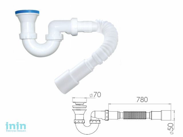 Сифон для душевого поддона U-образный h 130mm, выпуск 70 мм, с гибкой трубой 1 1/2" - 40/50мм, NOVA