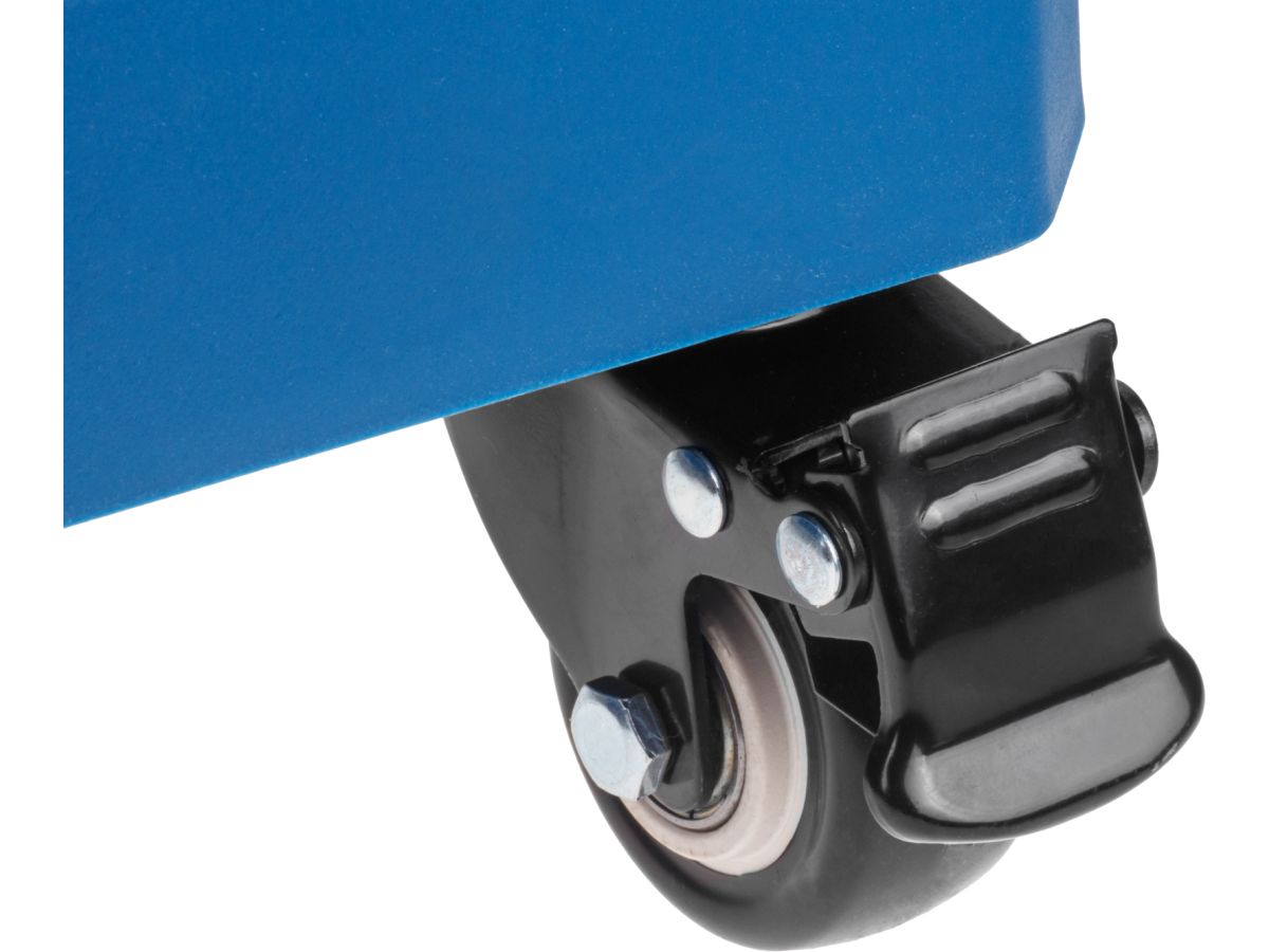 Оснащена четырьмя колесами с фиксаторами для удобной транспортировки и статичного хранения.