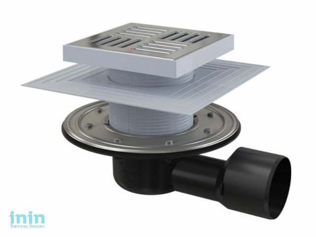 Сливной трап 150х150/50/75, боковой сток, решетка - нерж. сталь, гидрозатвор - комб. Alcaplast