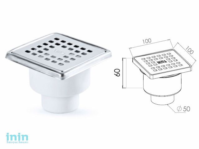 Сливной трап вертикальный D 50 с сухим затвором, с рамкой, решетка нерж. 100х100 мм, NOVA