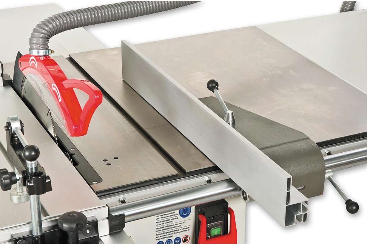Рабочий стол выполнен из чугунного литья, его можно расширить одной или двумя секциями. Первым ставится чугунный расширитель, к нему можно пристыковывать сегмент из стального листа, оборудованный опорой. Такая база позволяет распиливать детали с отступом 1220 мм от параллельного упора. Сам упор выполнен по классической для профессиональных станков схеме: крепится к массивному чугунному основанию, которое перемещается по цилиндрической направляющей и фиксируется эксцентриковым стопором.