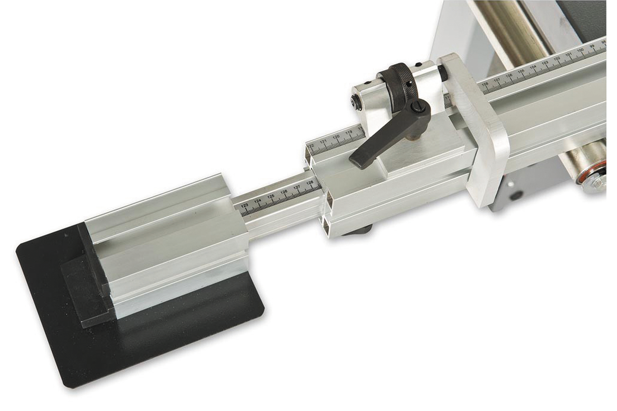 Станок оборудован подвижным столом (кареткой), ход которого составляет 1600 мм. При работе на нем деталь фиксируют при помощи углового упора, эксцентрикового прижима или продольного упора. В стандартный комплект входит и расширение подвижного стола с телескопической опорой и раздвижным поворотным упором заготовки. В разложенном состоянии его длина составляет 2200 мм, в сложенном 1200 мм.