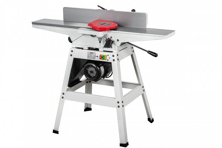 JJ-6OS — фуговальный станок с длинными чугунными столами для любительского применения. Имеет классический дизайн с регулировкой высоты столов по наклонным направляющим. Базируется на открытой подставке, в пространстве которой расположен асинхронный однофазный двигатель. Привод ножевого барабана одним клиновым ремнем. Регулируемый фуговальный упор и его кронштейн сделаны из массивных чугунных отливок. Сдвижной защитный экран – алюминиевый. Стружка удаляется через 100-миллиметровый патрубок и кожух, расположенные снизу станка.