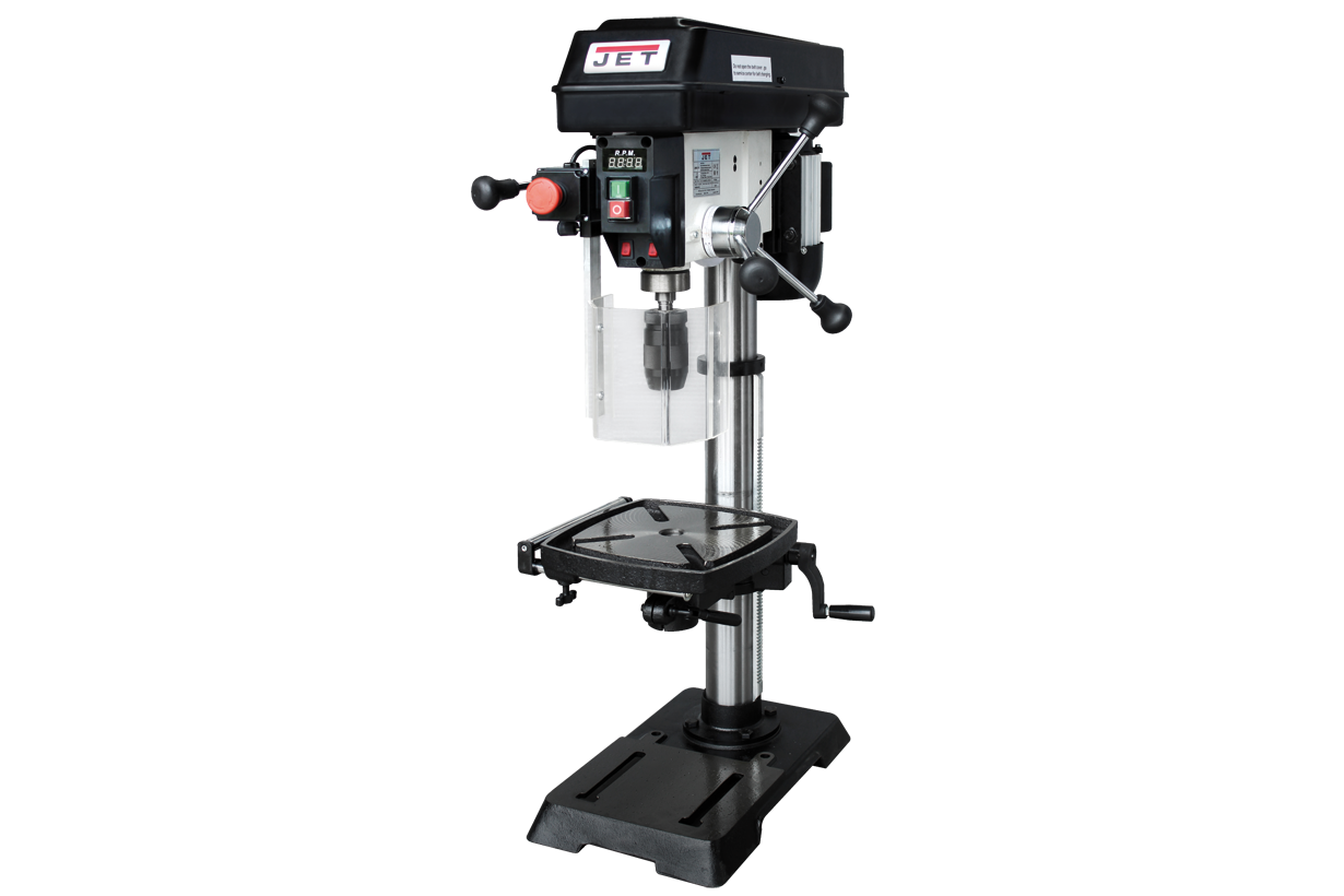 JWDP-12 — настольный сверлильный станок профессионального класса, подходящий для универсального (дерево и металл) применения. Основная отличительная черта этой модели – клиноременный вариатор, позволяющий плавно бесступенчато изменять скорость вращения шпинделя. Такая конструкция механизма ускоряет настройку в зависимости от диаметра сверления: вместо снятия и последующей установки ремня достаточно перевести рычаг, причем делают это, не выключая мотор. При этом фактическая скорость вращения шпинделя будет отображаться на цифровом дисплее, что особенно важно при работе с металлом, когда ограничения по частоте вращения режущего инструмента гораздо более строгие, чем при работе с деревом.
