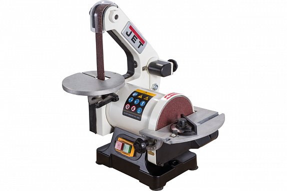 JET JBDS-5-M - компактный шлифовальный станок с ленточным и тарельчатым узлами. По назначению он универсален и позволяет работать с любыми распространенными в быту материалами: металлом, древесиной, пластиком, нетвердой керамикой и т.д. При этом могут производится самые разные операции: снятие покрытий, заточка режущего инструмента, «подгонка» формы заготовок и пр. Станок предназначен для любительской эксплуатации, но, несмотря на это, оборудован двигателем с режимом работы S1, что позволяет не делать перерывов на его охлаждение.