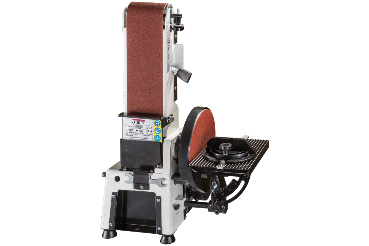 Тарельчато-ленточный шлифовальный станок JSG-233A-M для профессионального применения в частных столярных мастерских. Это относительно компактная модель, предназначенная для настольного размещения, но сделанная точно и основательно. Корпус выполнен литым из чугуна, что повышает устойчивость и способствует снижению вибраций при работе. Рабочий стол из алюминиевого литья и установлен на мощном поворотном кронштейне с дополнительной опорой, увеличивающей жесткость. В зависимости от необходимости его монтируют напротив тарельчатого или ленточного шлифовального узла.