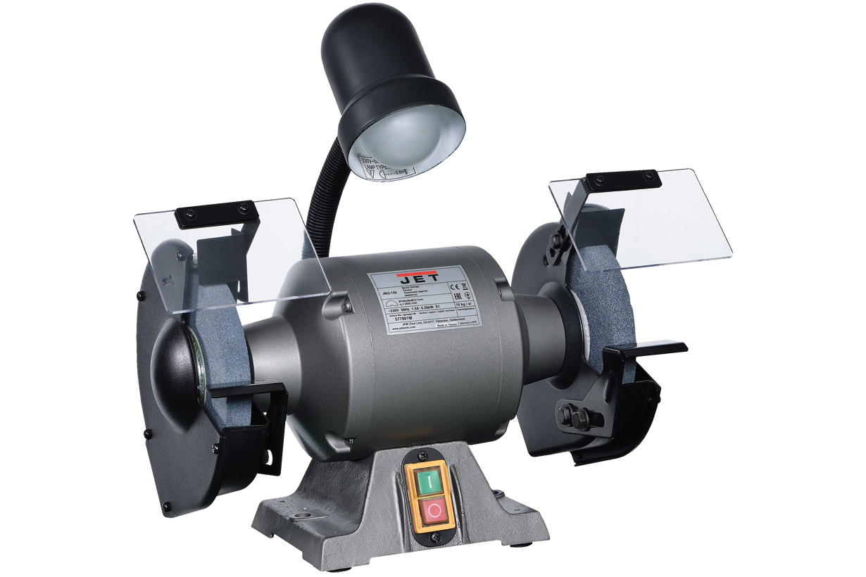 Jet JBG-150 — компактный заточной станок профессионального класса, работа для которого найдется в каждой мастерской, будь то заточка инструмента или обработка небольших заготовок, сделанных из практически любых материалов. Основные факторы, определяющие удобство работы с наждаком, — это запас мощности и отсутствие биений, поэтому требования к качеству исполнения конструкции весьма высоки, несмотря на её кажущуюся простоту. Заточной станок JBG-150 им полностью удовлетворяет: вал установлен в добротных пылеизолированных шариковых подшипниках, мотор обладает высокой по меркам класса мощностью и способен долго работать, не перегреваясь. Дополнительные факторы безопасности и удобства эксплуатации – лампа подсветки с гибким штативом, регулируемые прозрачные экраны и жёсткие стальные кожухи ограждения, на которых закреплены подручники.
