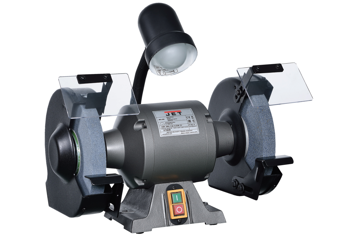 Заточной (наждачный) станок Jet JBG-200 с двумя камнями диаметром 200 мм для профессионального применения. У него прочная конструкция с массивным корпусом, качественные пылезащищённые шарикоподшипники ротора и мощный однофазный двигатель, позволяющий уверенно и быстро производить большинство работ по заточке инструмента и обдирке металлических заготовок. Компоновка стандартная: камни расположены на общем валу и закрыты прочными стальными кожухами безопасности, на них установлены регулируемые опоры для инструмента или заготовки и защитные экраны из прозрачного пластика.