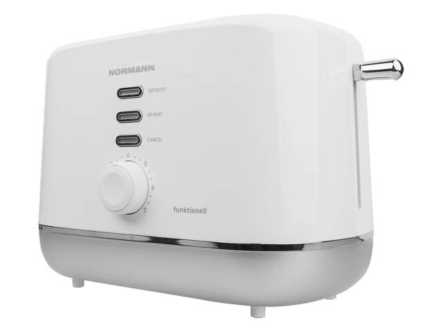 Функциональный тостер на 2 ломтика хлеба NORMANN Funktionell обладает всеми самыми необходимыми функциями для поджарки румяных тостов, такими как регулировка степени обжарки, подогрева и разморозки, функции досрочной отмены приготовления. Автоматическая центровка тостов позволяет равномерно прожарить тост любой толщины.
