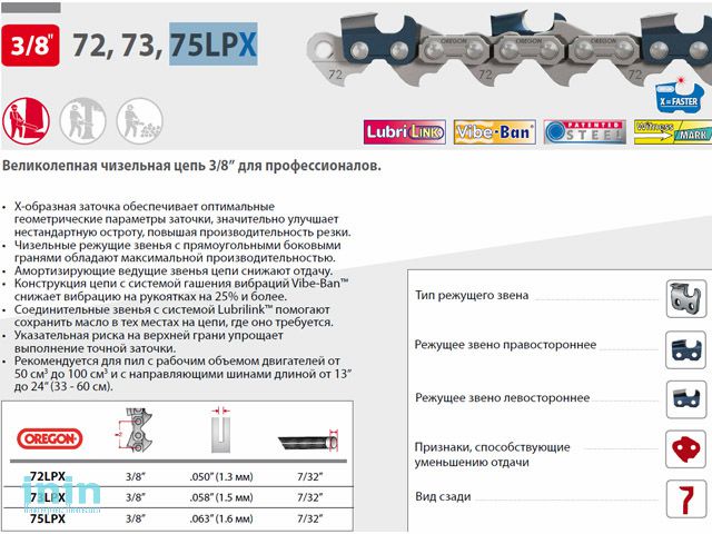 Цепь 37 см 15" 3/8" 1.6 мм 56 зв. 75LPX OREGON (затачиваются напильником 5.5 мм, для проф. интенсивного использования)