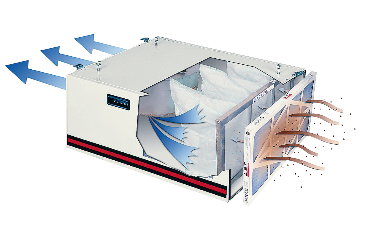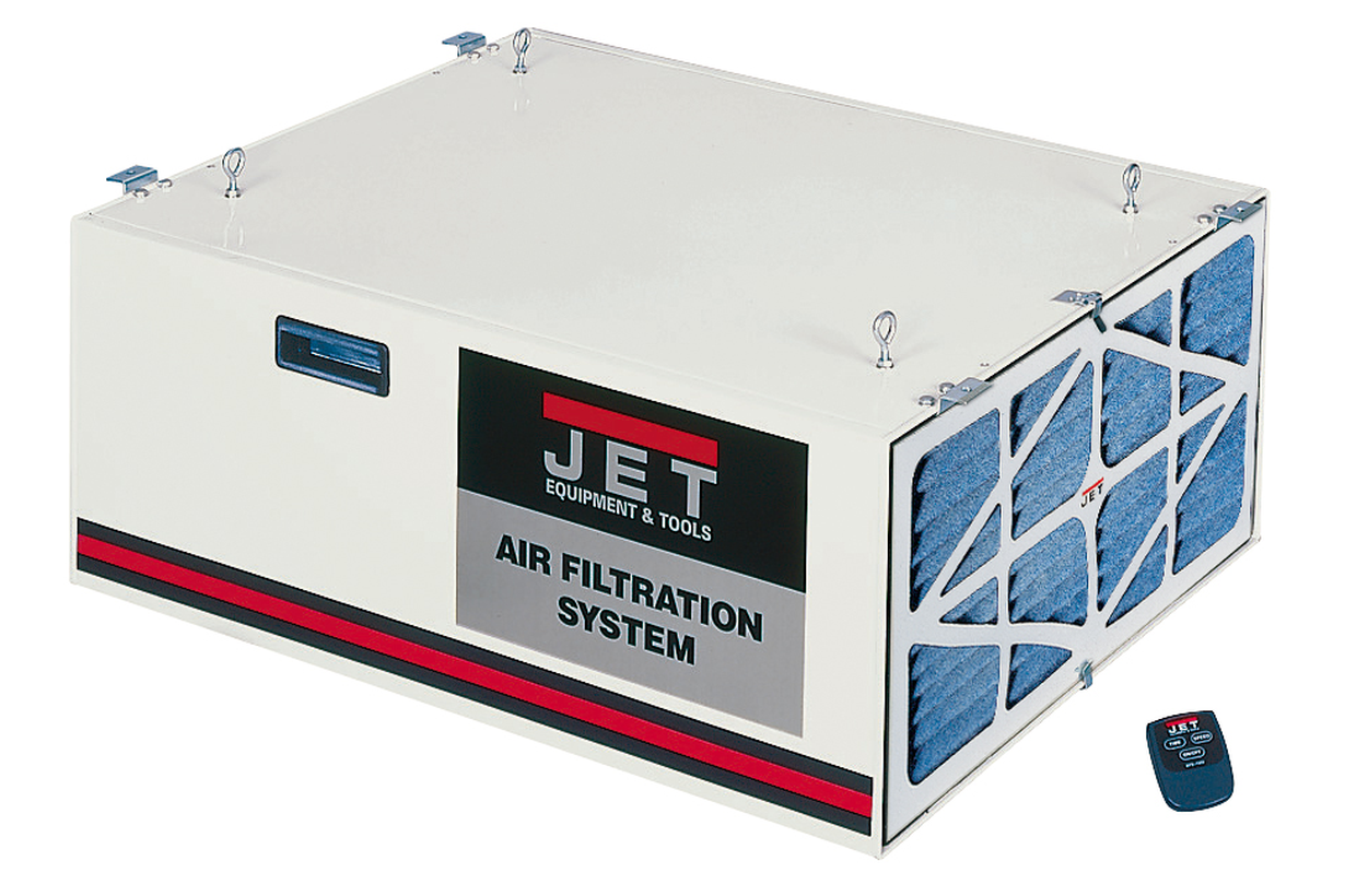 Система фильтрации Jet ASF-1000 B предназначена для очистки воздуха во всех производственных помещениях, где происходит загрязнение пылью или частицами лакокрасочных материалов, образующих взвесь. Предусмотрено два основных режима работы устройства: непрерывный и программируемый. Последний используют для очистки помещения в нерабочее время: при помощи ДУ-пульта устанавливают таймер на 2, 4 или 8 часов и мощность (производительность работы) – отработав программу, AFS-1000 B B отключится. Система фильтрации – двухступенчатая. В штатный комплект поставки входит наружный электростатический фильтр. Он очень эффективен и задерживает большую часть загрязнений, оставляя на долю основного встроенного фильтра лишь самую тонкую фракцию взвеси (в основном частицы менее 5 мкм). Внешний электростатический фильтр можно заменить на опционный угольный: он удаляет не только механические, но и некоторые химические загрязнители, очищая воздух от запахов. Монтаж системы производят на высоте не менее двух метров от пола на опору, выдерживающую не менее 40 кг статической нагрузки; также предусмотрены петли для подвеса к потолку. Производительность устройства соответствует помещению объемом до 300 кубических метров.